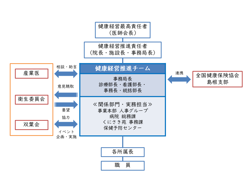 益田市医師会は、「益田市医師会 健康経営宣言」の下、健康経営を推進しています。地域の皆様に質の高い保健・医療・福祉のサービスを提供するため、職員一人ひとりの心身が健康であり、自らの能力を最大限に発揮できる職場環境が重要だと考えます。職員の健康保持・増進に向けた取り組みを推進し、すべての職員が活き活きやりがいを持って働き続けられる環境づくりに努めることを、ここに宣言します。