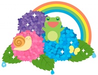 梅雨梅雨といえば紫陽花ですね。よく見ると、カエルやカタツムリがあちこちらか覗いています。 |