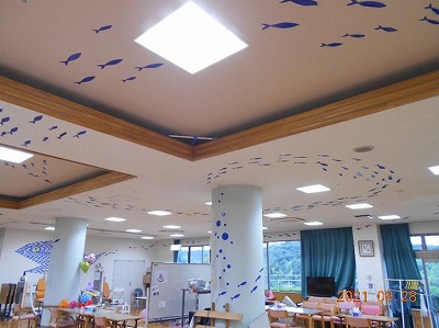 夏フロア全体を水族館に見立てて魚達が泳ぎ回ってるような飾りを作ってみました |
