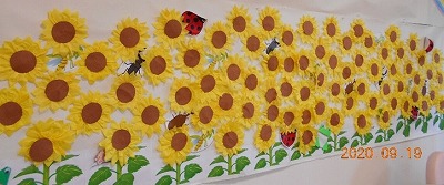 夏といえば向日葵の花でしょうか 黄色い鮮やかな花が壁一面んい咲きほこっています。 |